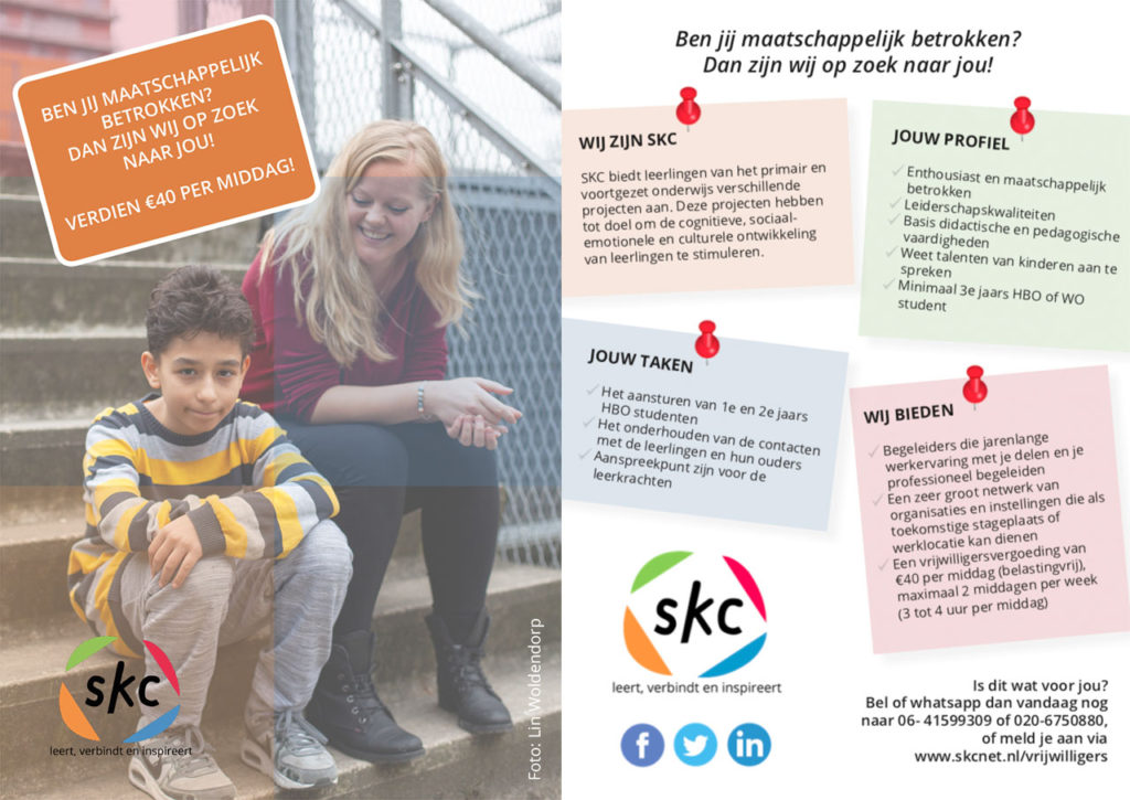 Vind je het leuk om met kinderen te werken, iets positiefs te betekenen voor de samenleving, je werkervaring te verbreden én veel te leren? Dan zijn wij op zoek naar jou! De Stichting voor Kennis en sociale Cohesie biedt verschillende projecten op het primair en voortgezet onderwijs. Deze projecten hebben als doel om de cognitieve, sociaal-emotionele en culturele ontwikkeling van jongeren te stimuleren.